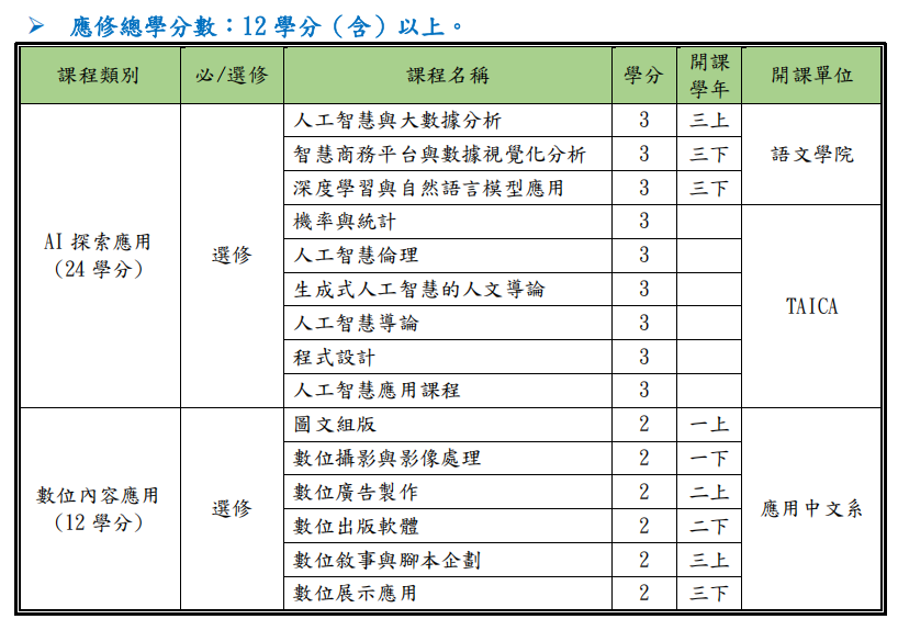 針對臺灣大專院校人工智慧學程聯盟( TAICA)所開課 之四個 學分學程 之所有 課程皆認列於